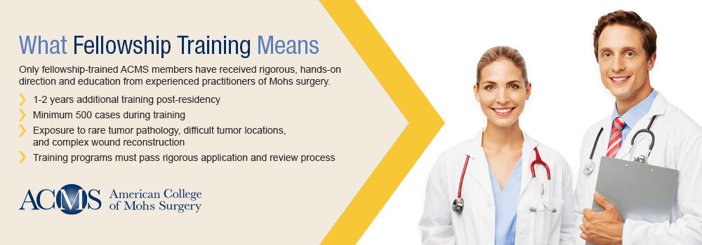A Mohs surgeon is a board-certified dermatologist that has successfully completed a 1-2 year ACGME approved subspecialty fellowship with intense training in skin cancer surgery and management, skin pathology, and dermatologic reconstructive surgery. The American College of Mohs Surgery (ACMS) is a membership organization of more than 1,400 fellowship trained skin cancer and reconstructive surgeons specializing in the Mohs micrographic surgical technique used to treat skin cancer. The ACMS is the only organization that requires its members to have successfully completed an extensive one- to two-year fellowship training program in Mohs micrographic surgery after they have completed their years of dermatology residency training.
